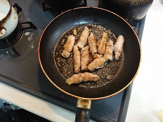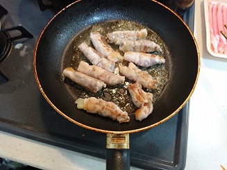 7.フライパンにサラダ油を適量入れ、巻き終わりを下にして中火で焼きます。