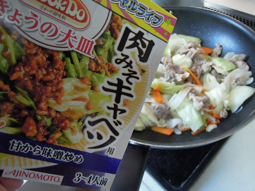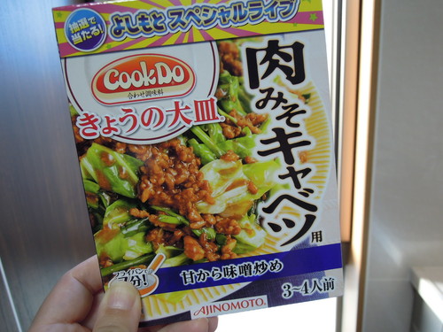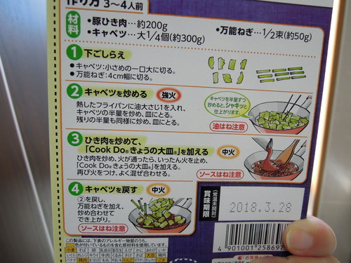 たとえばCookDo肉みそキャベツ、こちらは本来豚ひき肉と万能ねぎ、キャベツで作るものなのですが…