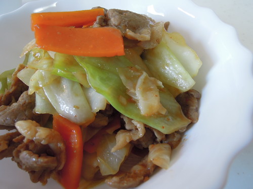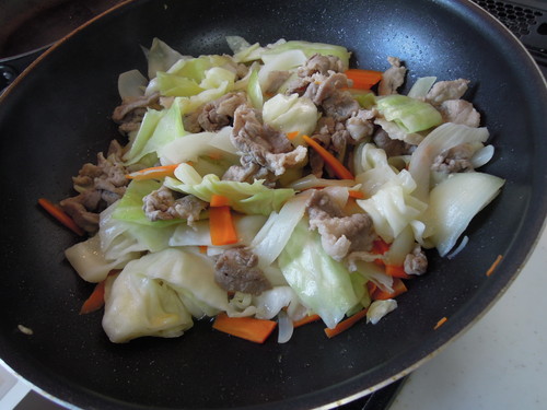 私は豚ばら肉、キャベツ、たまねぎ、にんじんを入れて、野菜多め、具だくさんで作りました。